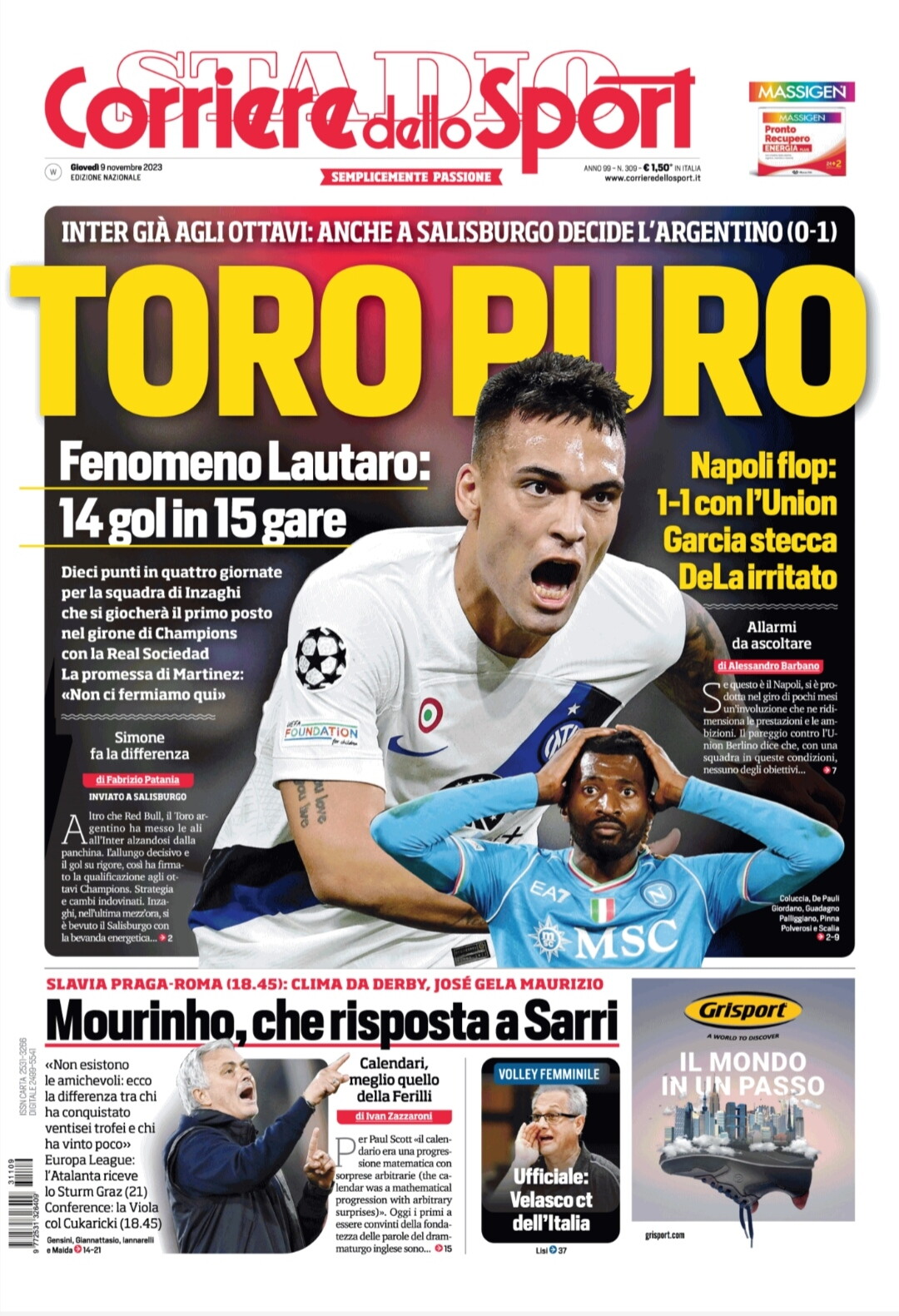 “Inter, gjithnjë ai”, shkruan La Gazzetta dello Sport, titull shoqëruar me foton e Martinez. “Dem i pastër”, ishte titulli i përzgjedhur nga Corriere dello Sport. Një biletë për më tej nga Grupi D siguroi edhe Real Sociedad. Spanjollët mposhtën Benfikën me rezultatin 3-1, 10 pikë në 4 ndeshje, po aq sa edhe Inter, provizorisht në vendin.
