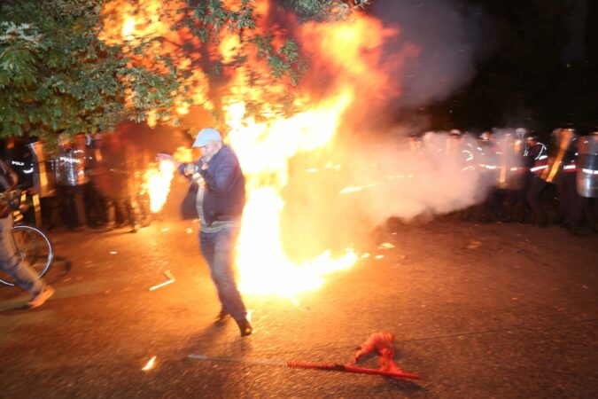 Pamjet e një protestuesi që përfshihet nga flakët pasi bomba molotov i shpërthen te këmbët kanë bërë xhiron e rrjetit. Kryetari i grupit parlamentar të PD, Gazment Bardhi ka publikuar videon e këtij momenti. Në pamje duket se lënda plasëse hidhet nga protestuesit në drejtim të kordonit të policisë te Bashkia e Tiranës.